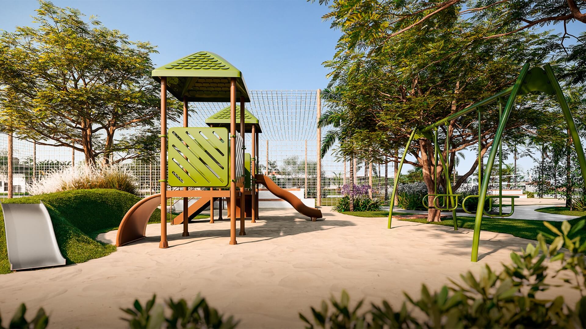 Integrado ao paisagismo, o ambiente garante criatividade e liberdade, proporcionando segurança para a diversão das crianças.